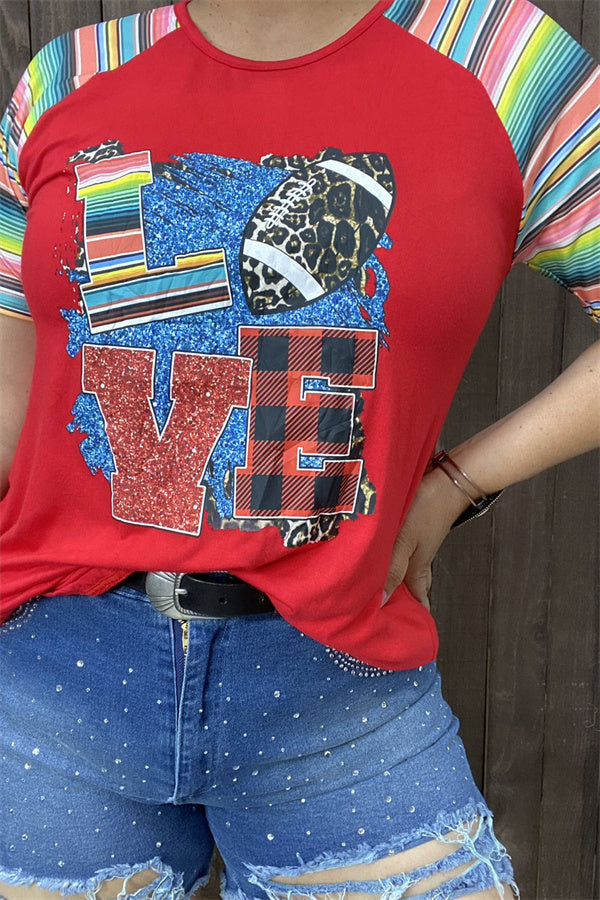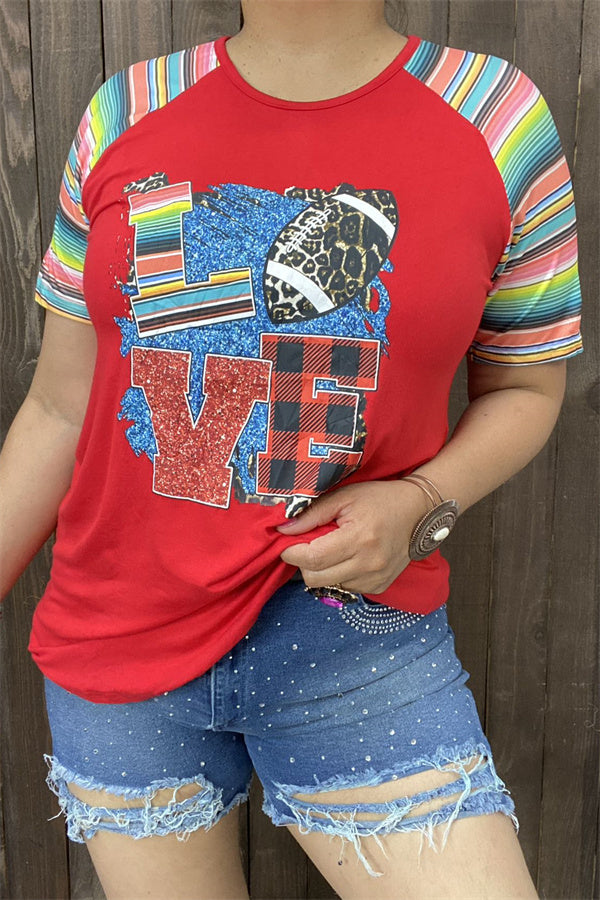 DLH7753 LOVE Football graphic printed red background fabric multi color stripe raglan short sleeve women tops