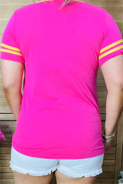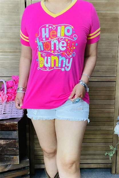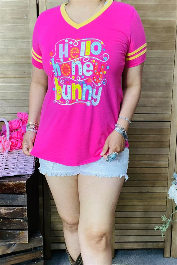 Top features wording "Hello honey bunny" on fuchsia background with short sleeves.