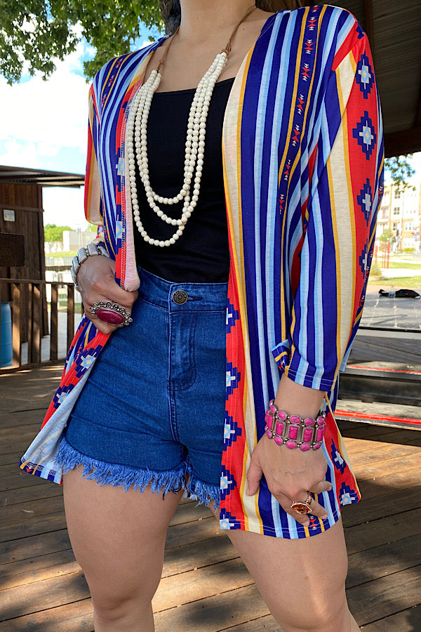 - Cardigan features with multicolor AZTEC printed cardigan with 3/4 sleeves.