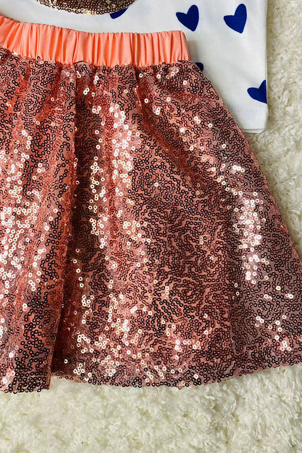 Top features blue hearts printed on white background with golden bunny sequin embroidery with a peach bow & ruffle short sleeves.