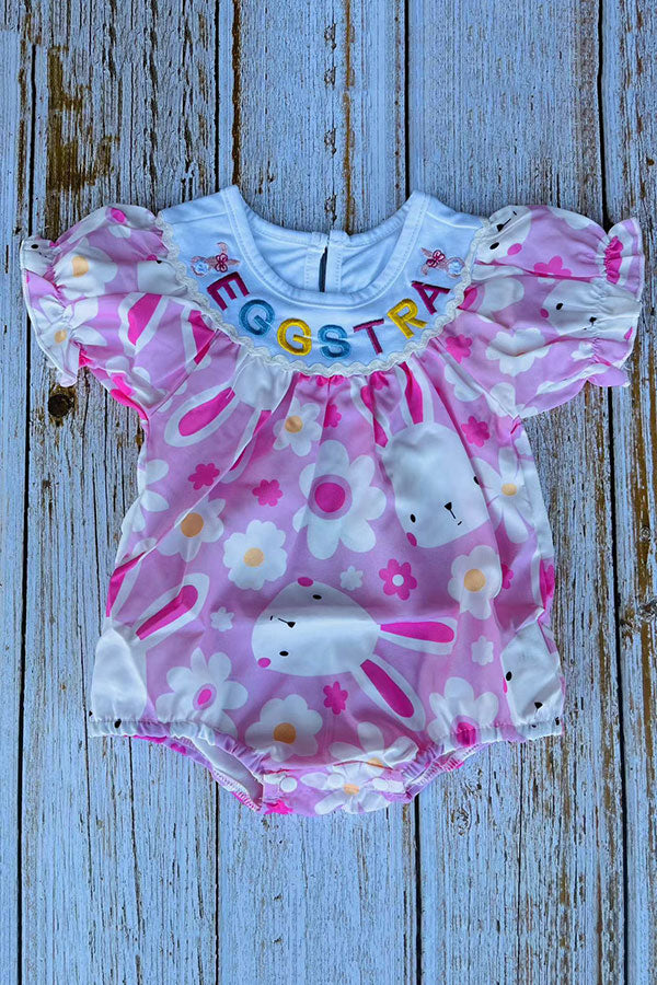 Romper features with EGG START & bunny embroidery & pink bunny printed with ruffle short sleeves. Snap buttons at bottom.
