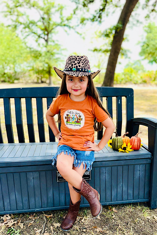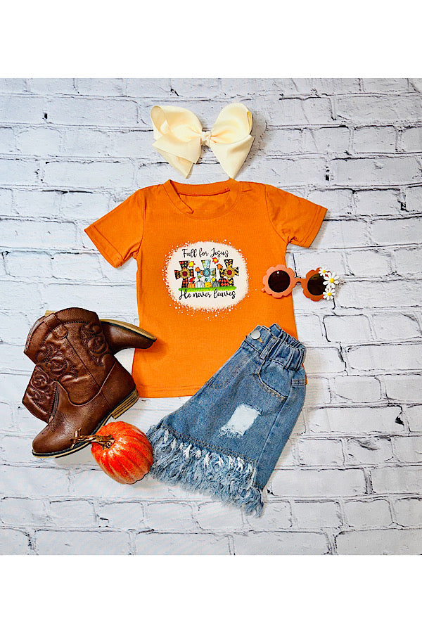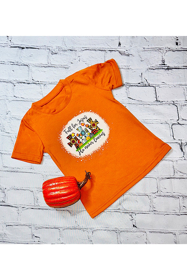 - Top features "FALL FOR JESUS, HE NEVER LEAVES" wording w/three crosses & multi print pumpkins print on burnt orange background & short sleeve cut.