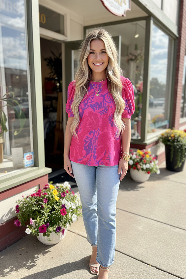 Top features with pink & fuchsia floral printed & puff short sleeves.