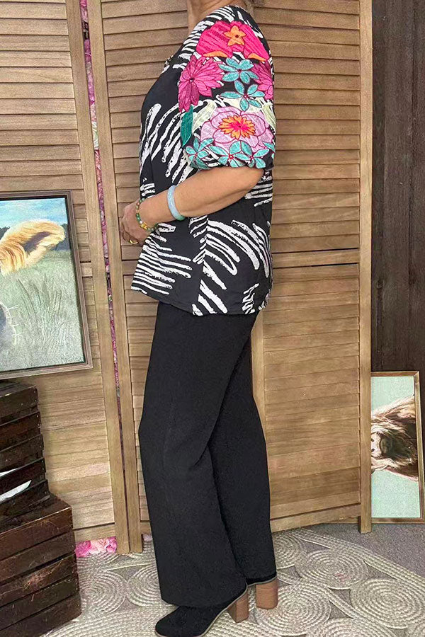 Top features with flower emboridery on black patterns background with puff short sleeves.