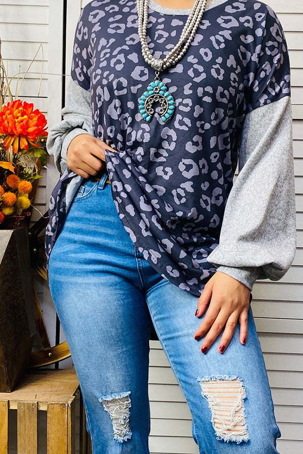 FW9890 Leopard printed blouse w/solid grey bubble sleeves