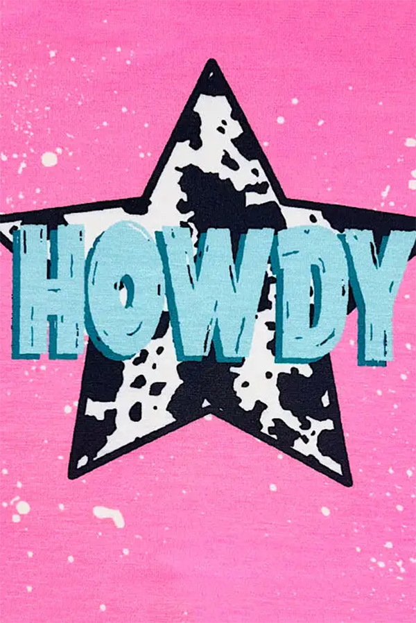 Top features with "HOWDY" & Stars printed on tie dye pink background with short sleeves.