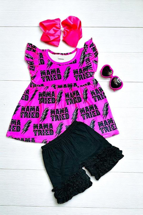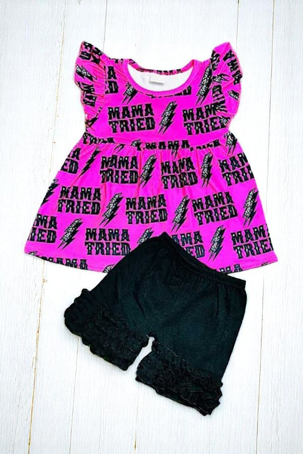 Top features "MAMA TRIED" wording w/leopard thunder prints on hot pink background & ruffle short sleeve cut.