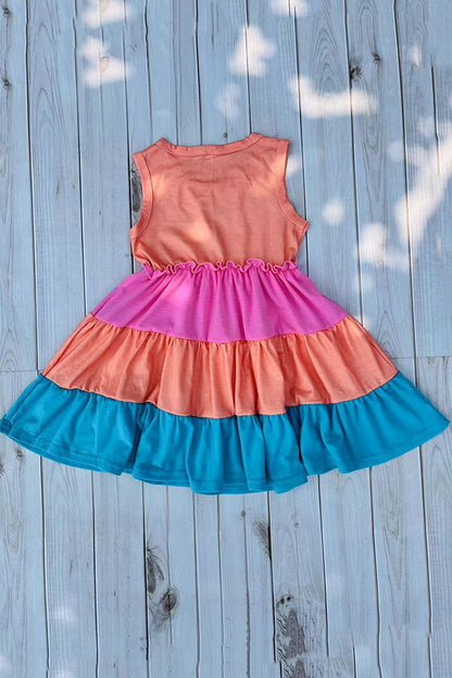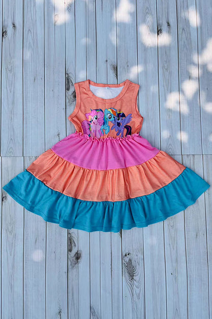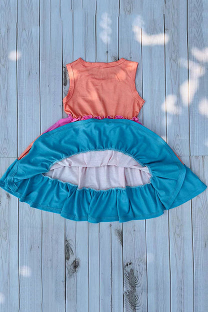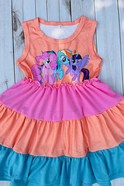 Dresses features with unicorn prints on orange background, pink & orange & teal color block & sleeveless.