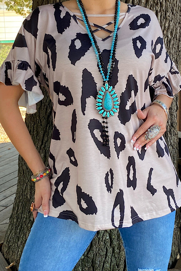 - Top features leopard printed on off-white background with trim short sleeve and criss cross neckline.
