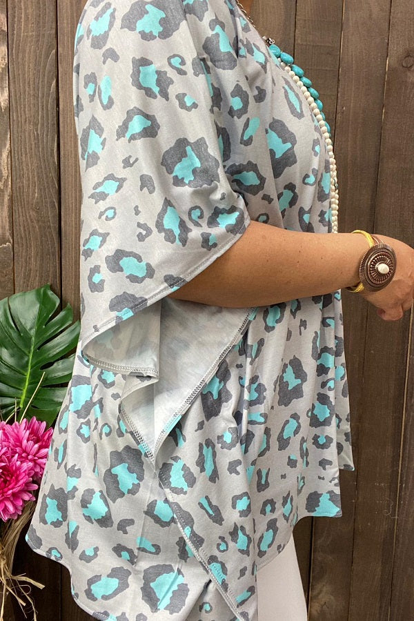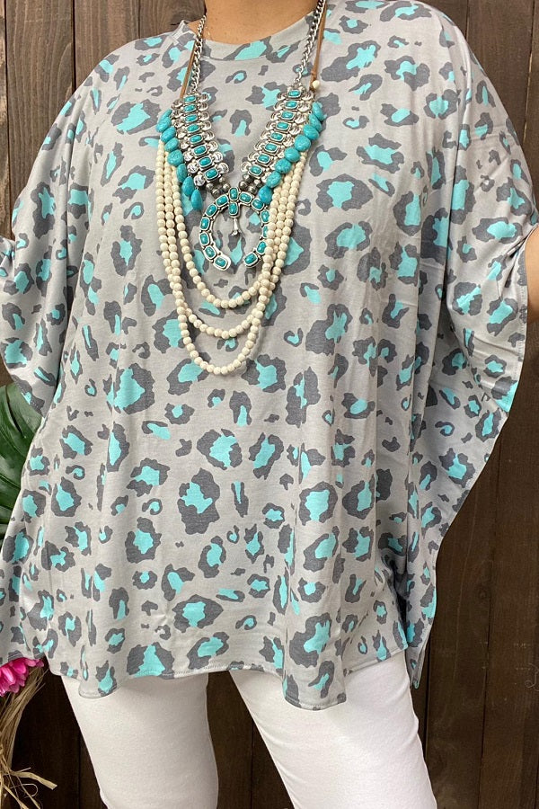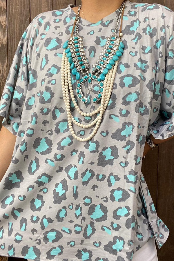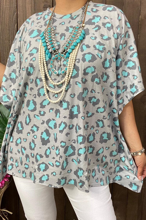 - Top features turquoise & black leopard prints on grey background with short sleeves.
