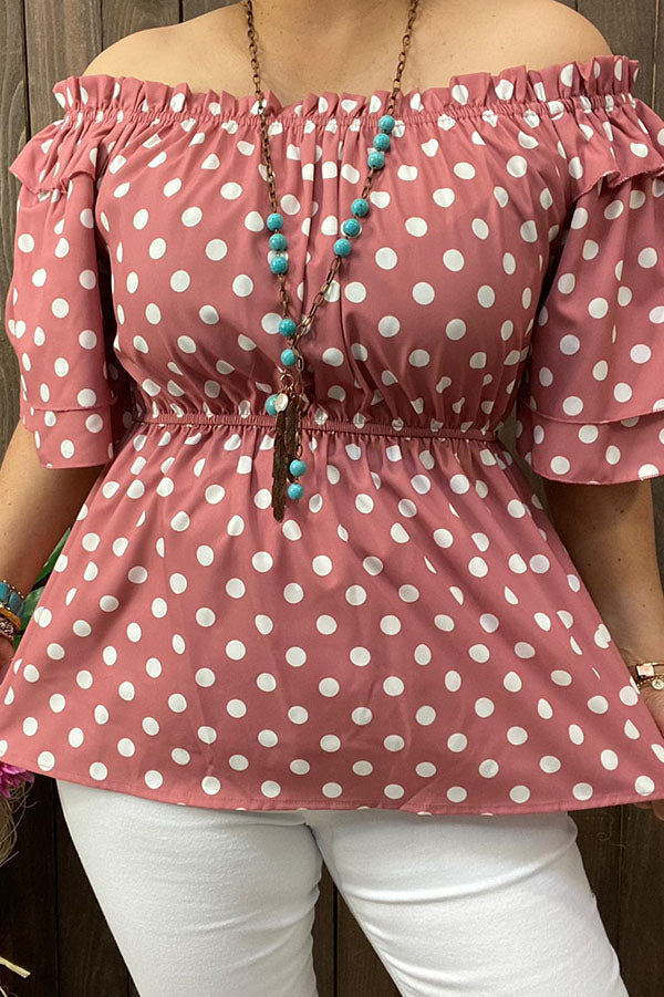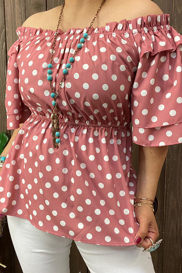 - Top features white dot prints on blush background with off shoulder and ruffle sleeves.