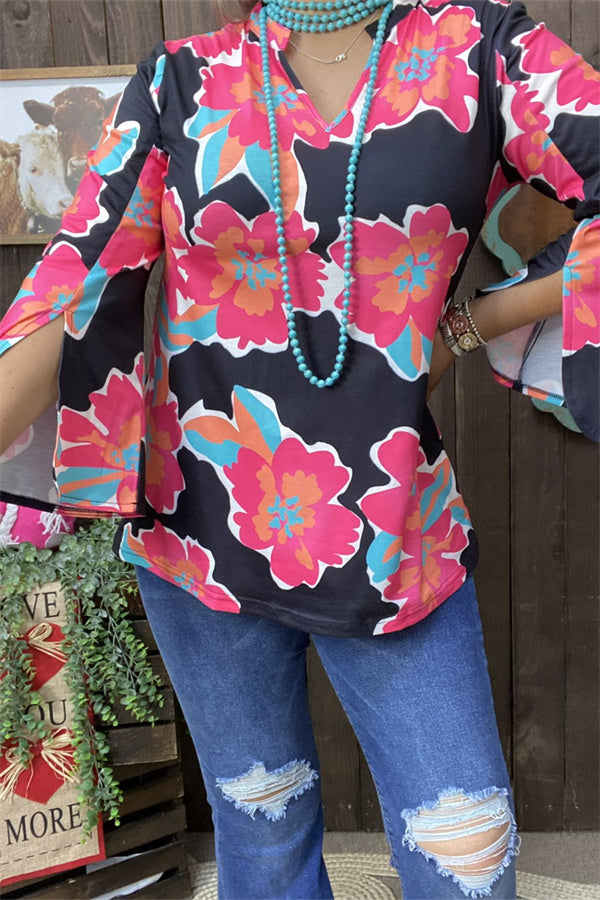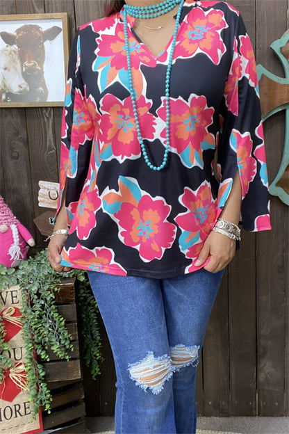 GJQ15749 Turquoise/Fuchsia/Orange floral printed 3/4 sleeve w/side split women black tops w/v-neckline