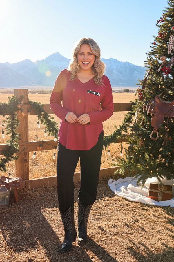 GJQ9792-1 Solid Fuchsia v-neck long sleeve top w/cow print front pocket (DS13)