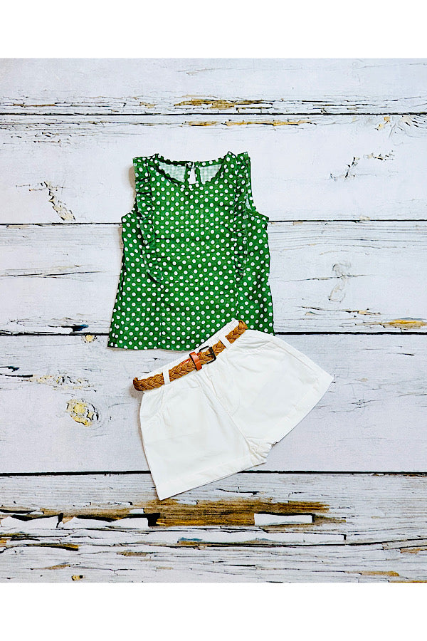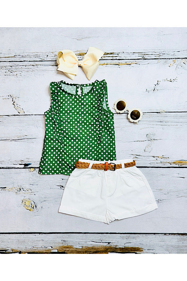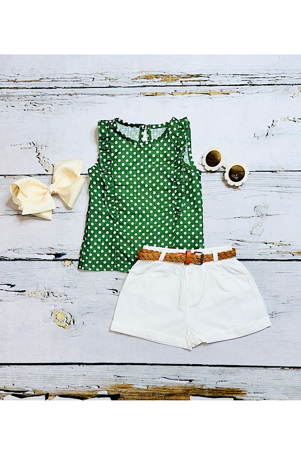 - Top features white polka dots on green background w/ruffles & sleeveless cut.