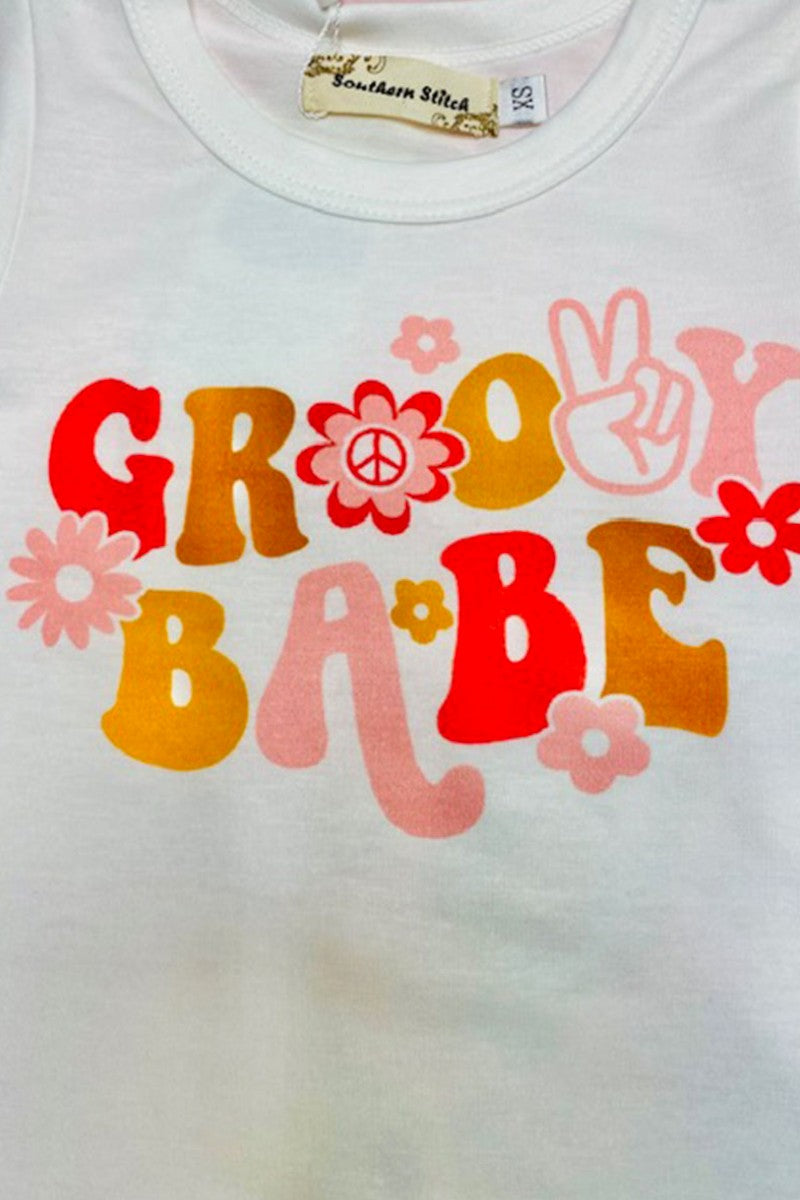 - Top features "GROOVY BABE" wording surrounded by flowers & a peace sign on solid white background & short sleeve cut.