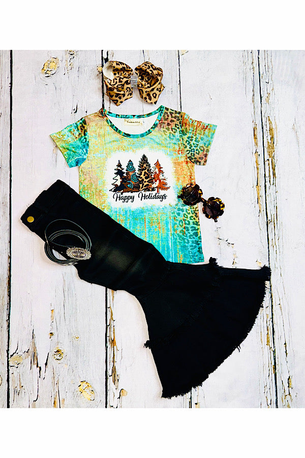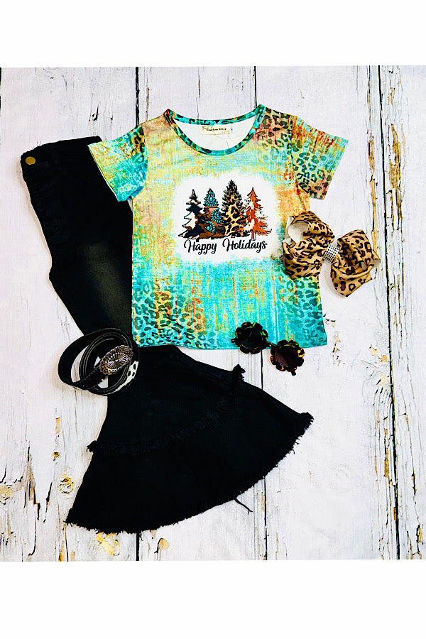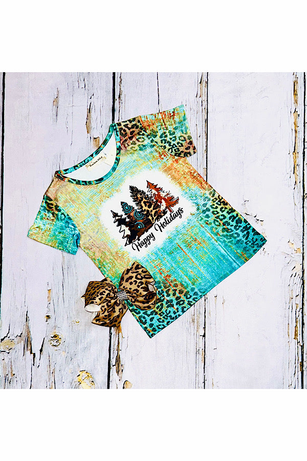 - Top features "HAPPY HOLIDAYS" wording w/cowhide, leopard, & turquoise jewels print christmas trees on burnt orange background & short sleeve cut.