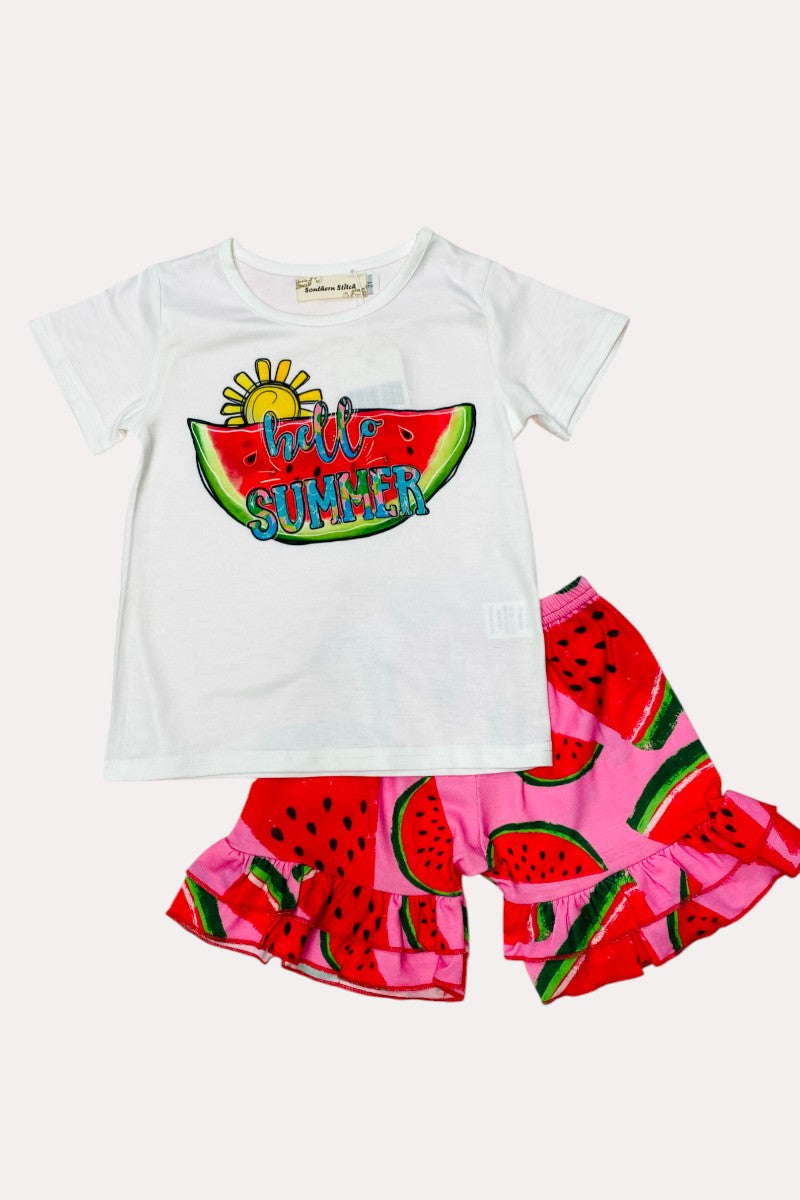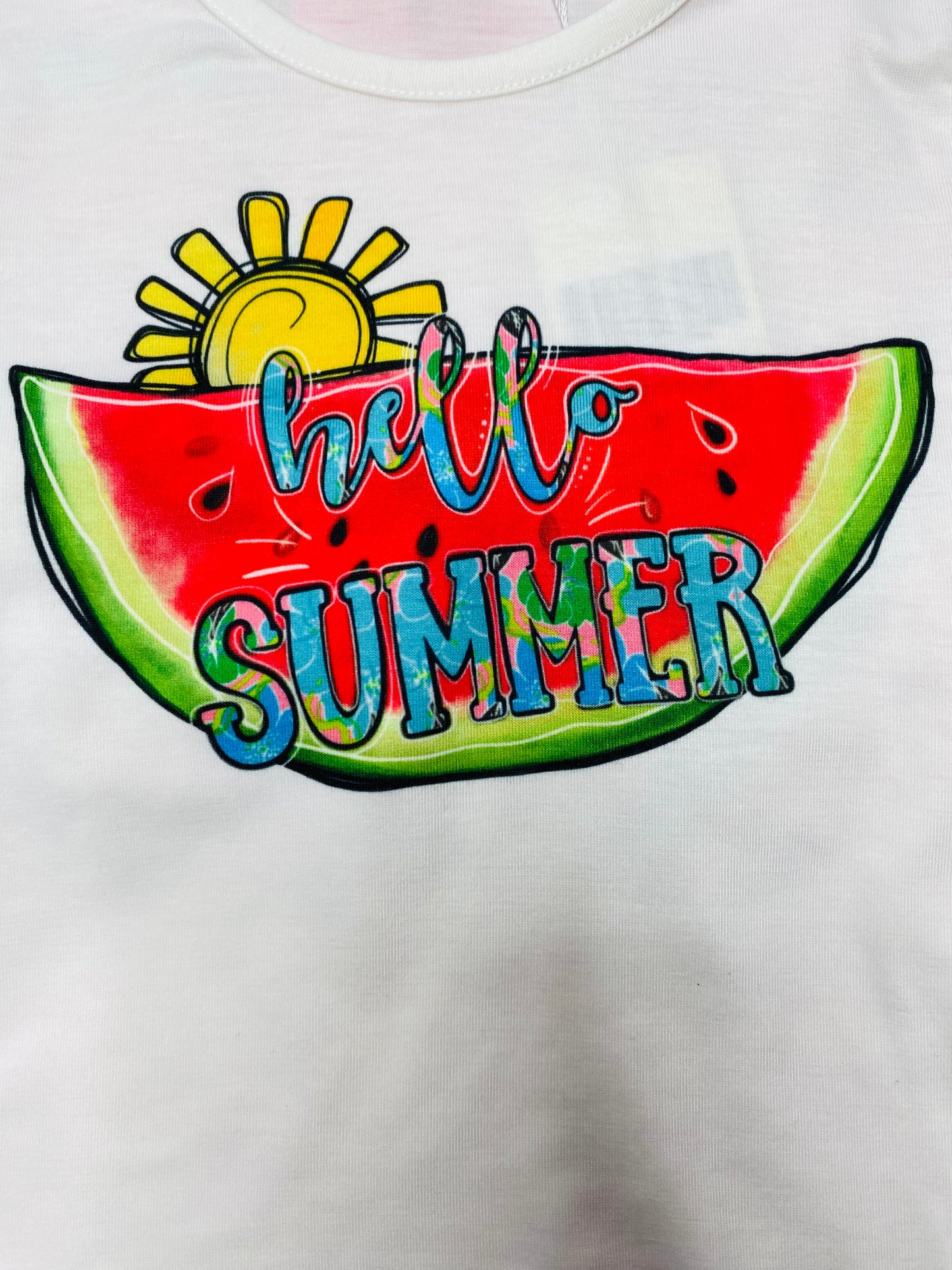 - The top features "HELLO SUMMER" wording with a watermelon and a sun as logo on a solid white background.