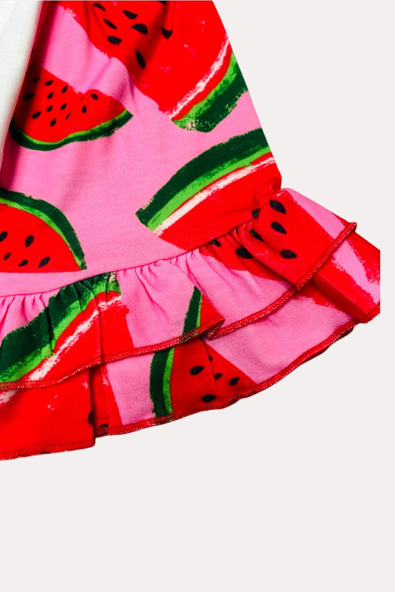 - The feature cute watermelon slices on a pink background print.