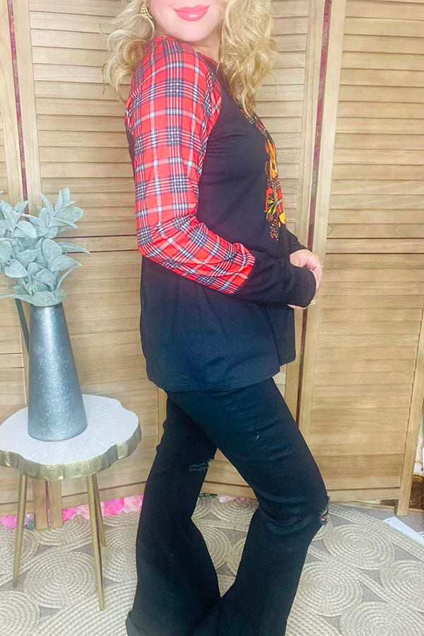 Top features with HO HO HO Cute cup of tea printed on black background with plaid long sleeves.