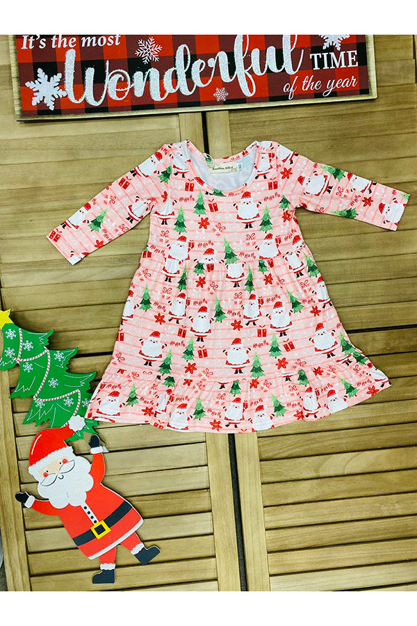 - The dress features HoHoHo & Santa & Christmas tree print in pink stripe background & long sleeve cut.