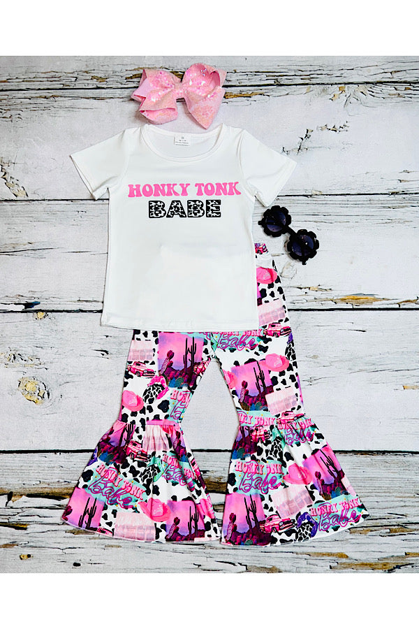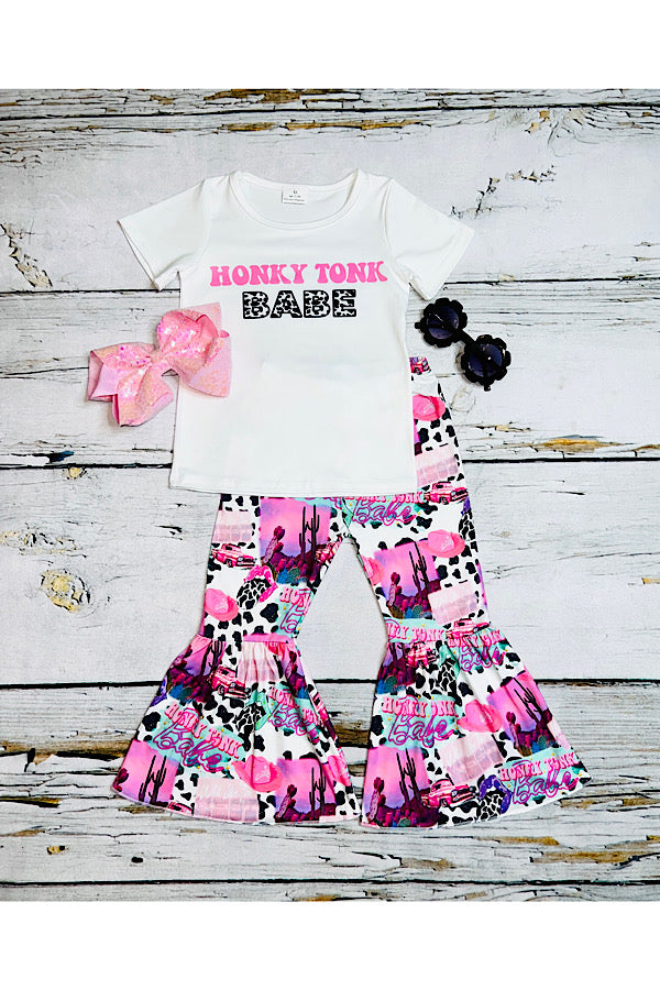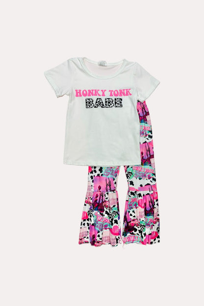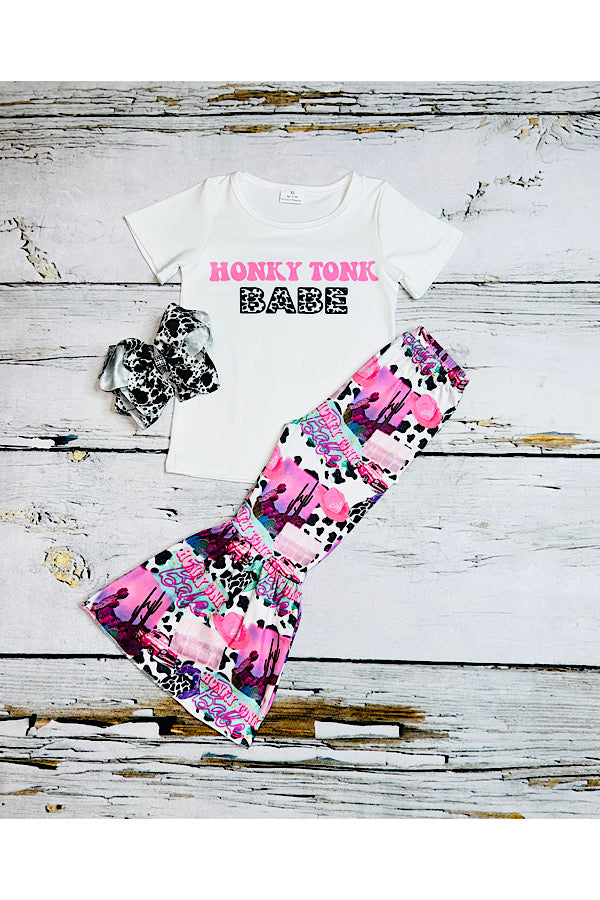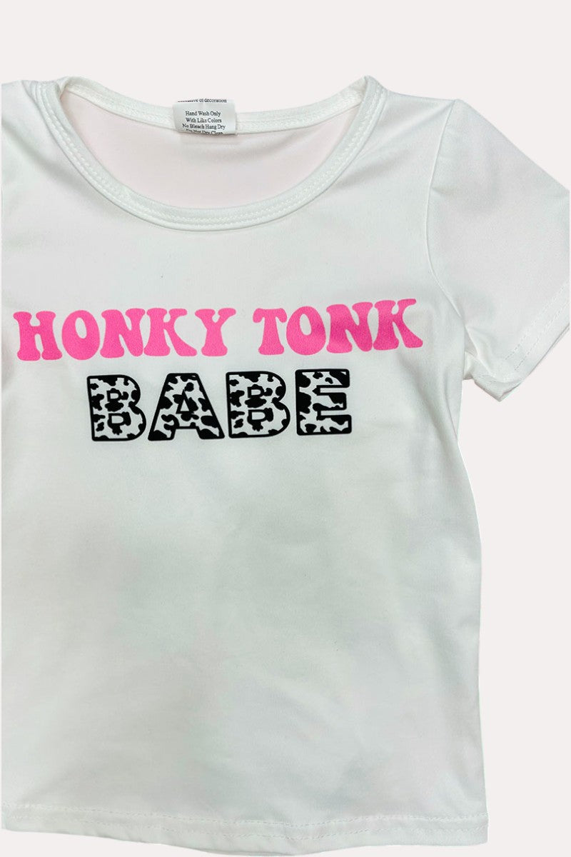 - The top features wording" HONKY TONK BABE " on a white short sleeve t-shirt.