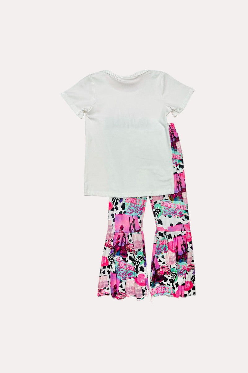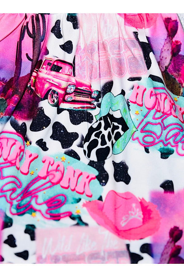 - The pants are colorful western Honky Tonk words and image print with flared ruffle.