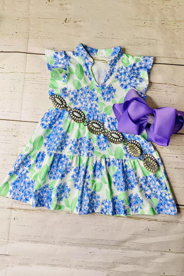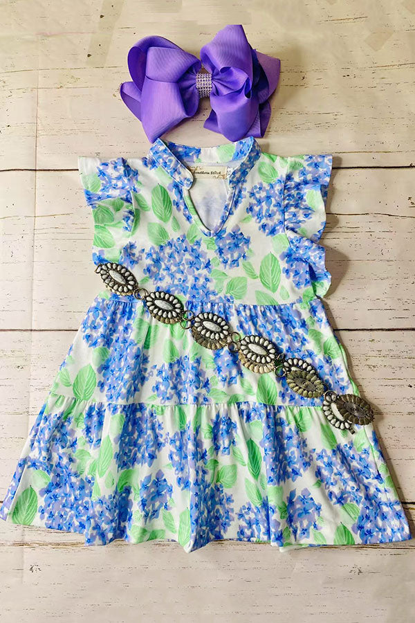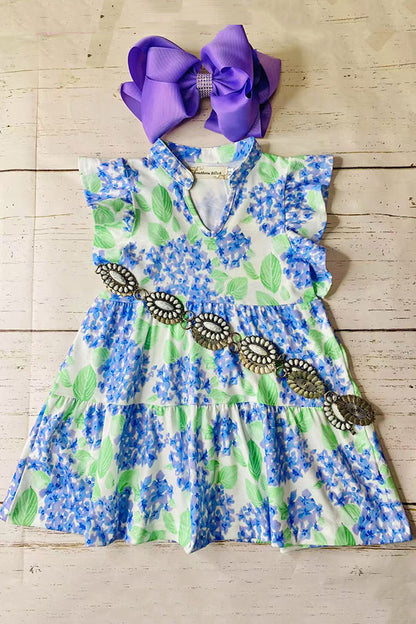 Dress features with green & blue floral printed on white background with flutter sleeves and V-neckline.