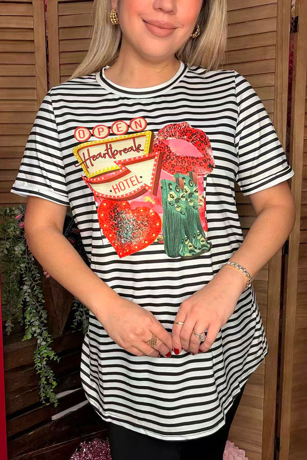 Top features with open heartbrake hotel v-day printed on stripes printed with short sleeves.