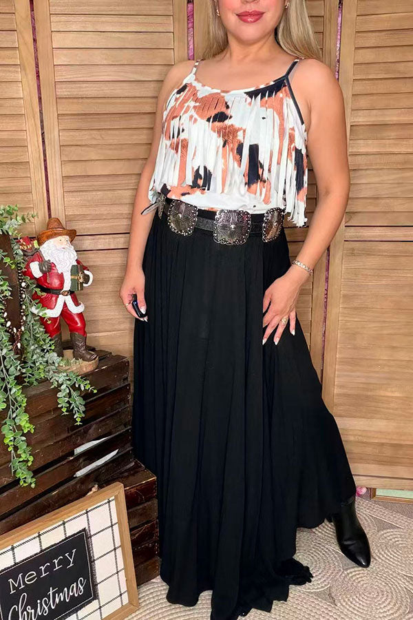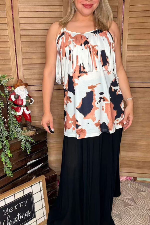 Top features with leopard printed with fringes.