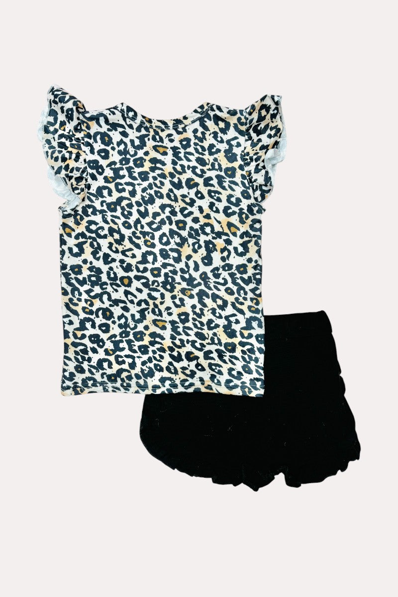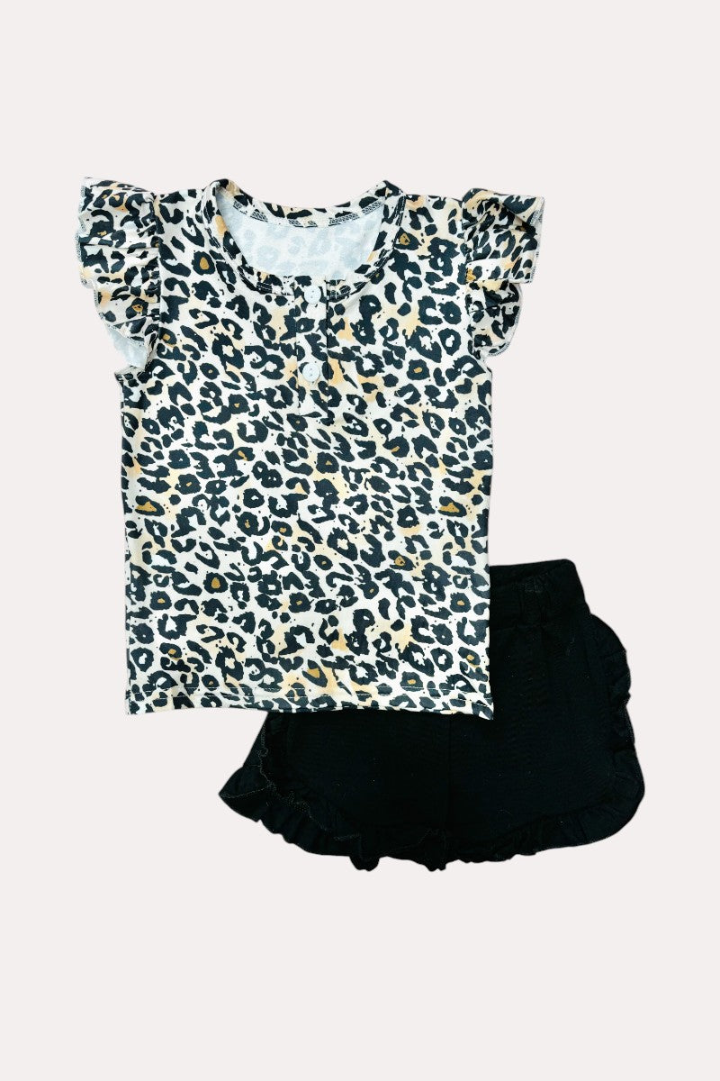 - Top features a cute leopard print with two white buttons & ruffle short sleeves.