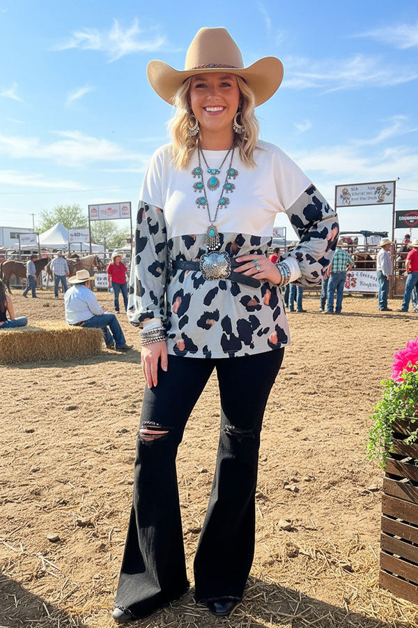 - Top features with leopard & white color block & long sleeves.