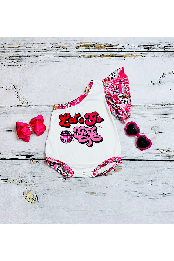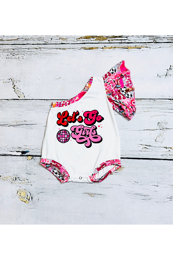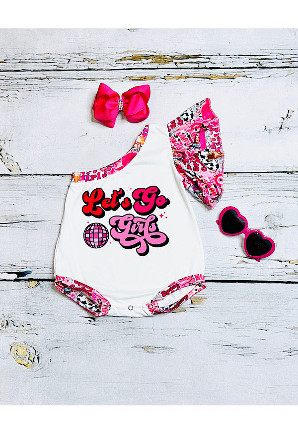 - Onesie features "LET'S GO GIRLS" wording w/a disco ball logo on a white background & one ruffle sleeve cut.