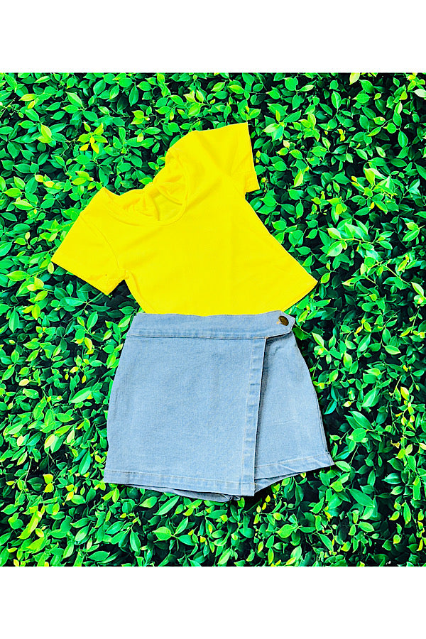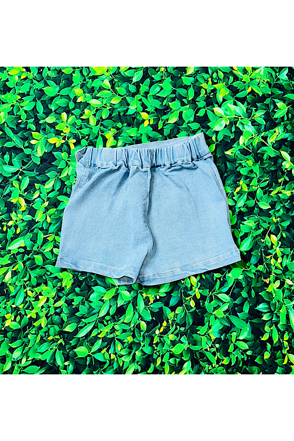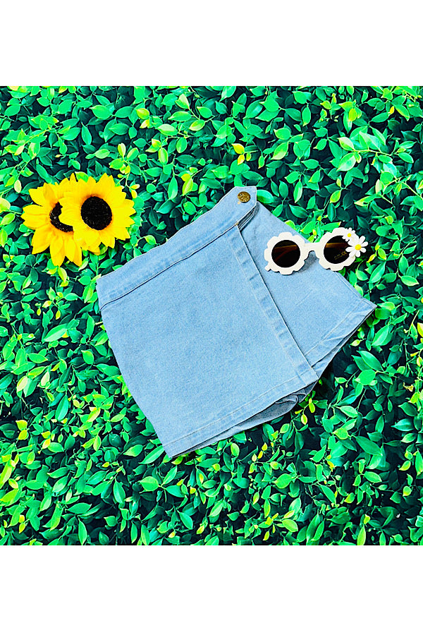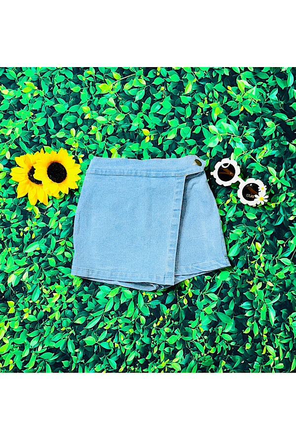 - Skort feature light wash denim w/a side button & elastic waist.