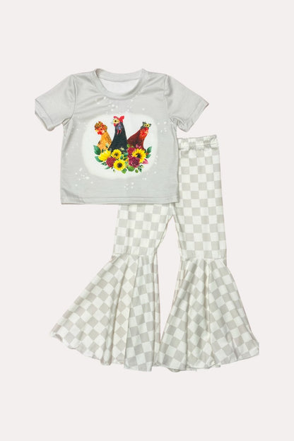- Top features three cute fashion chickens surrounded by sunflowers on a light gray bleached short sleeve t-shirt.