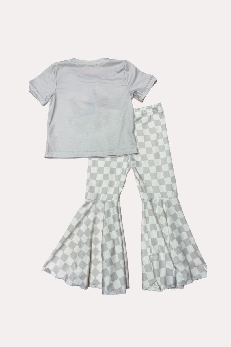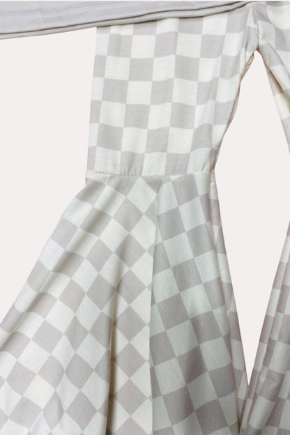 - Bottoms feature a white & light gray checkers print.