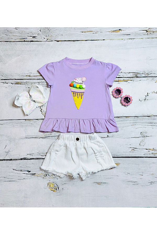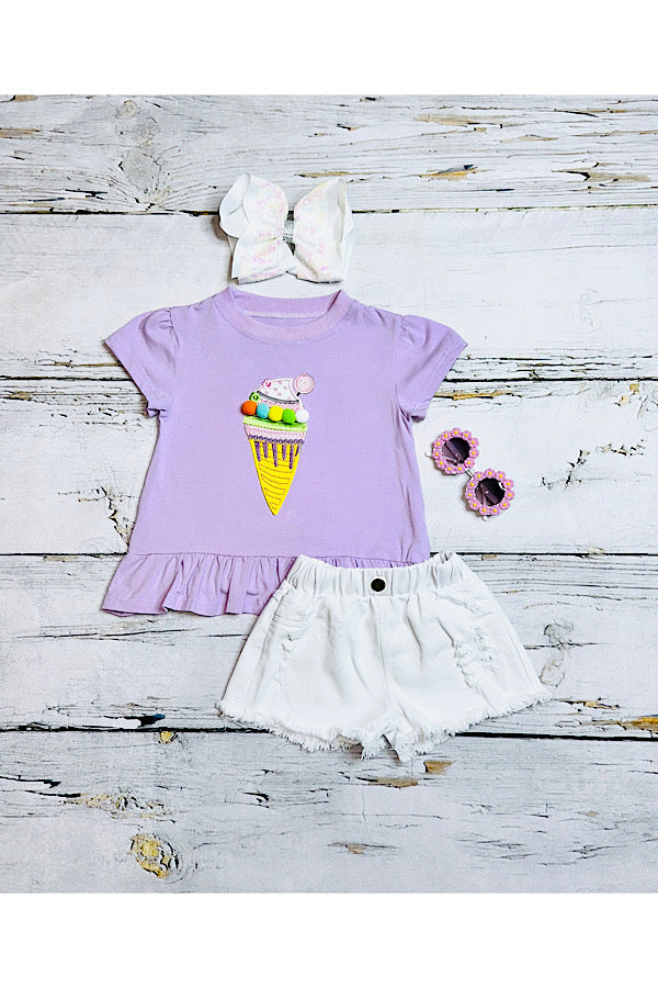 - Top features an embroidered ice cream cone w/pompoms on light purple background & short sleeve cut.