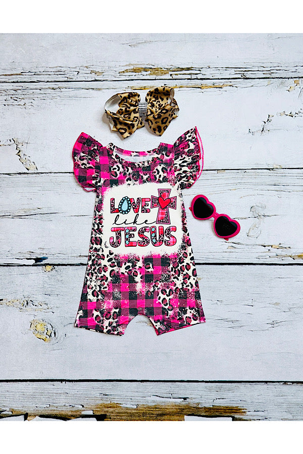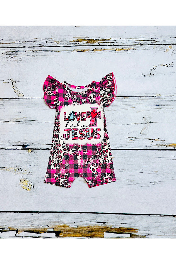 - Romper features "LOVE LIKE JESUS" wording w/a cross & heart logo on cheetah & pink/black plaid print background w/short ruffle sleeve cut.