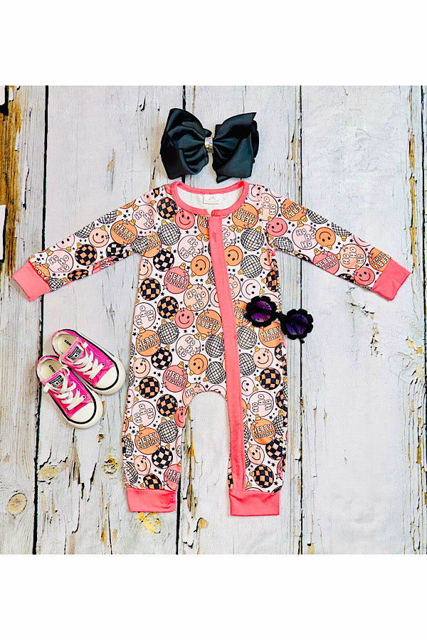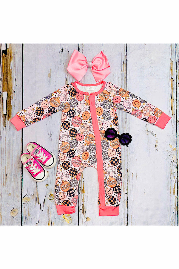 - Romper features "MERRY CHRISTMAS" wording w/multi print spheres & smiley faces on light pink background.