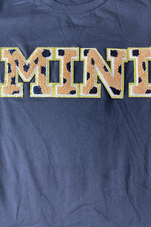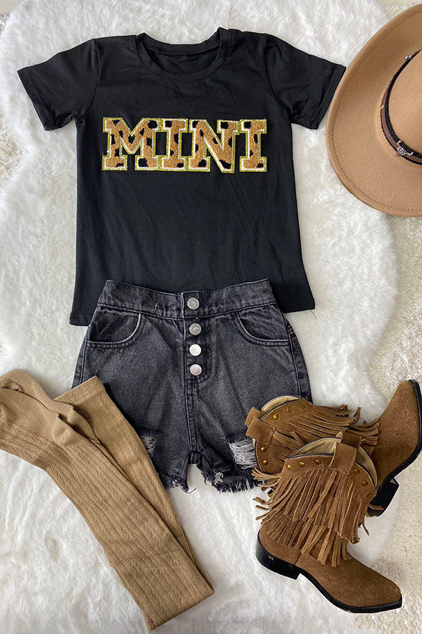 - Top features leopard MINI embroidery on black background with short sleeves.