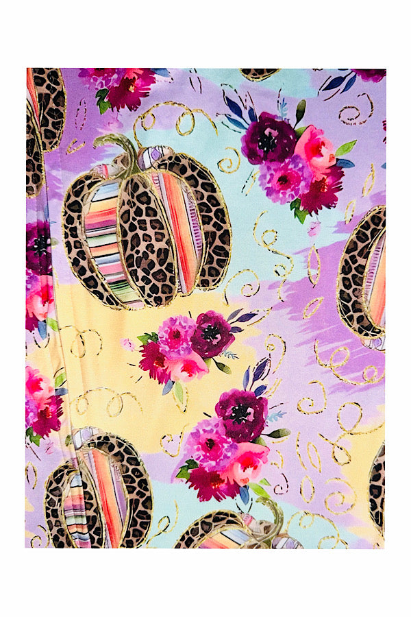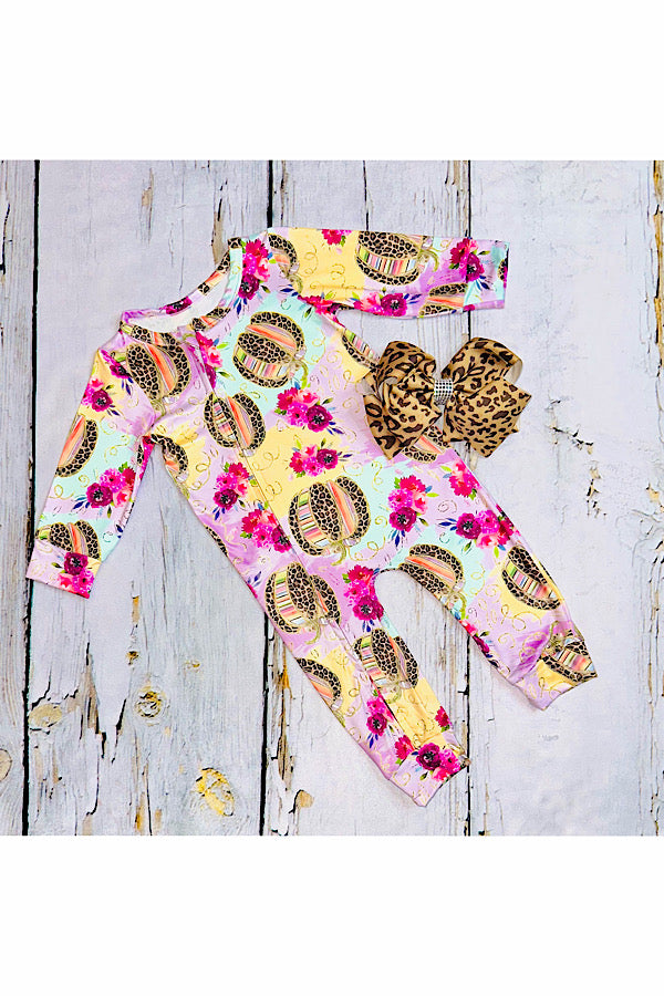 - Romper features multicolor & leopard pumpkins & purple tones floral print on light purple background & long sleeve cut.