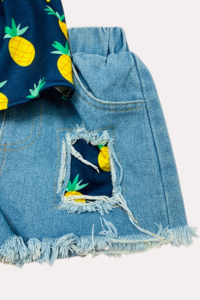 - Shorts are light wash blue denim w/pineapple patches & elastic waistband.