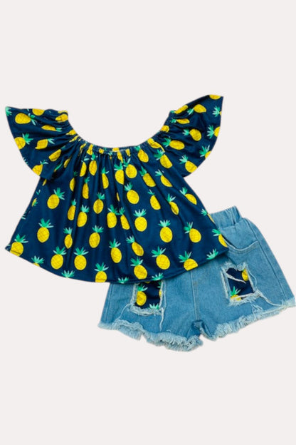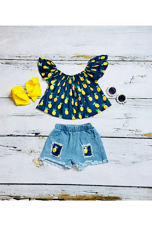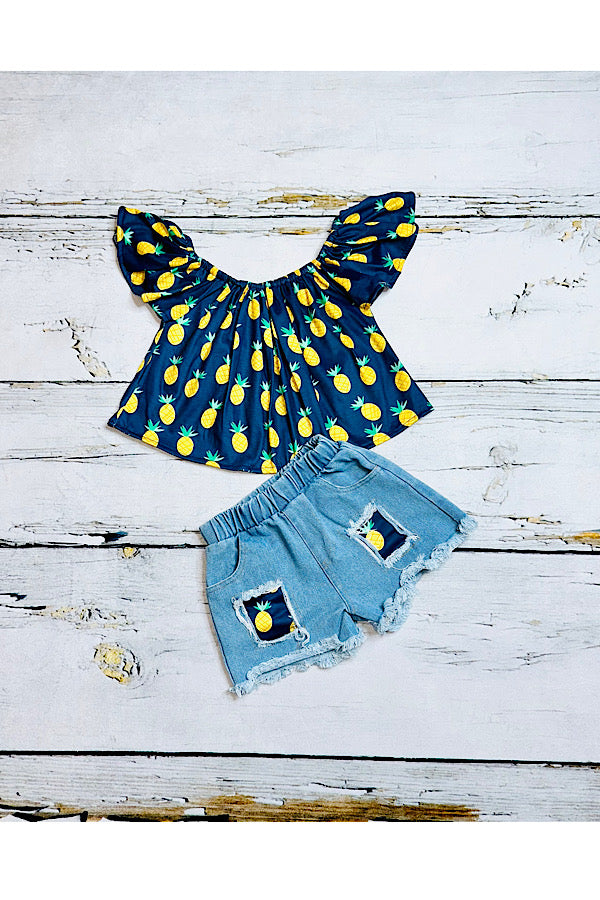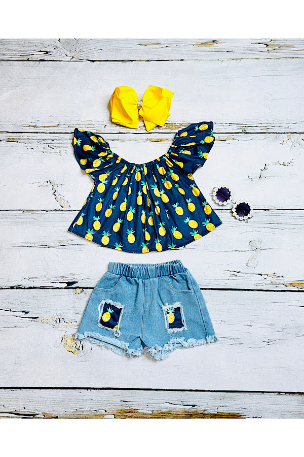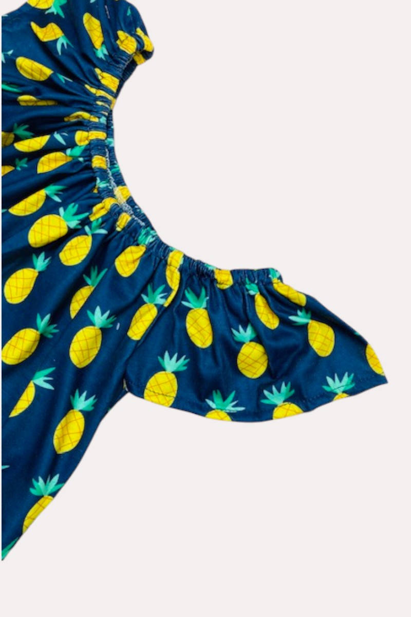 - Top features yellow small pineapples on navy blue background on off the shoulder short sleeve cut.