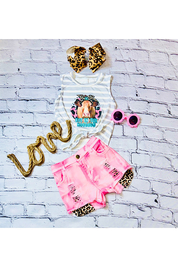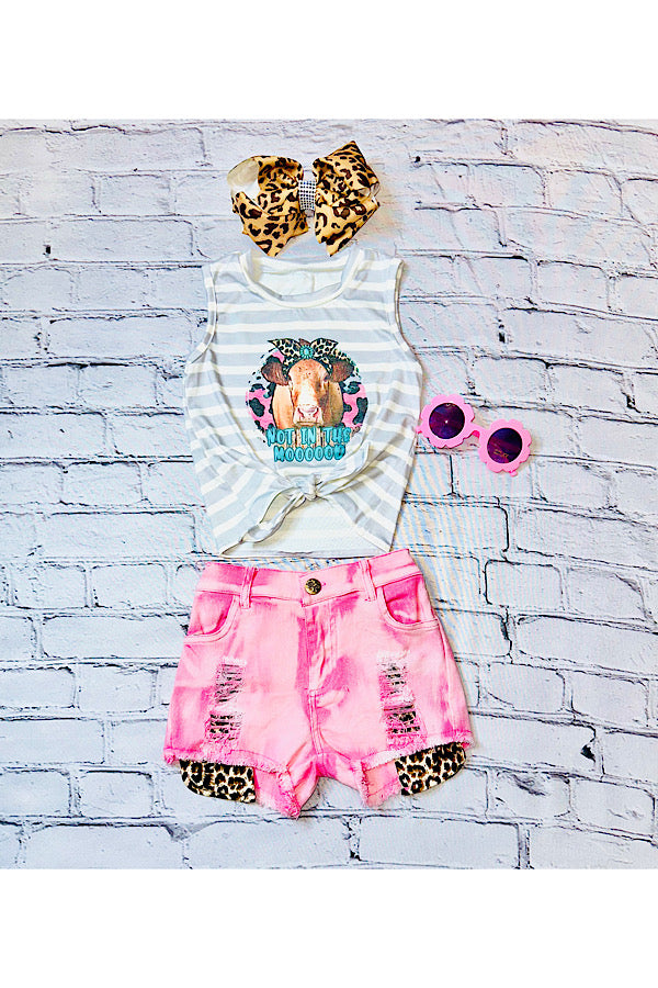 - Shorts feature pink washed denim w/leopard print patches.