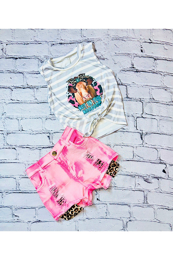 - Top features "NOT IN THE MOOOOOD" wording w/a cow face logo on gray & white stripped background & sleeveless cut.
