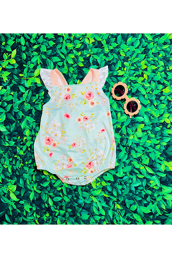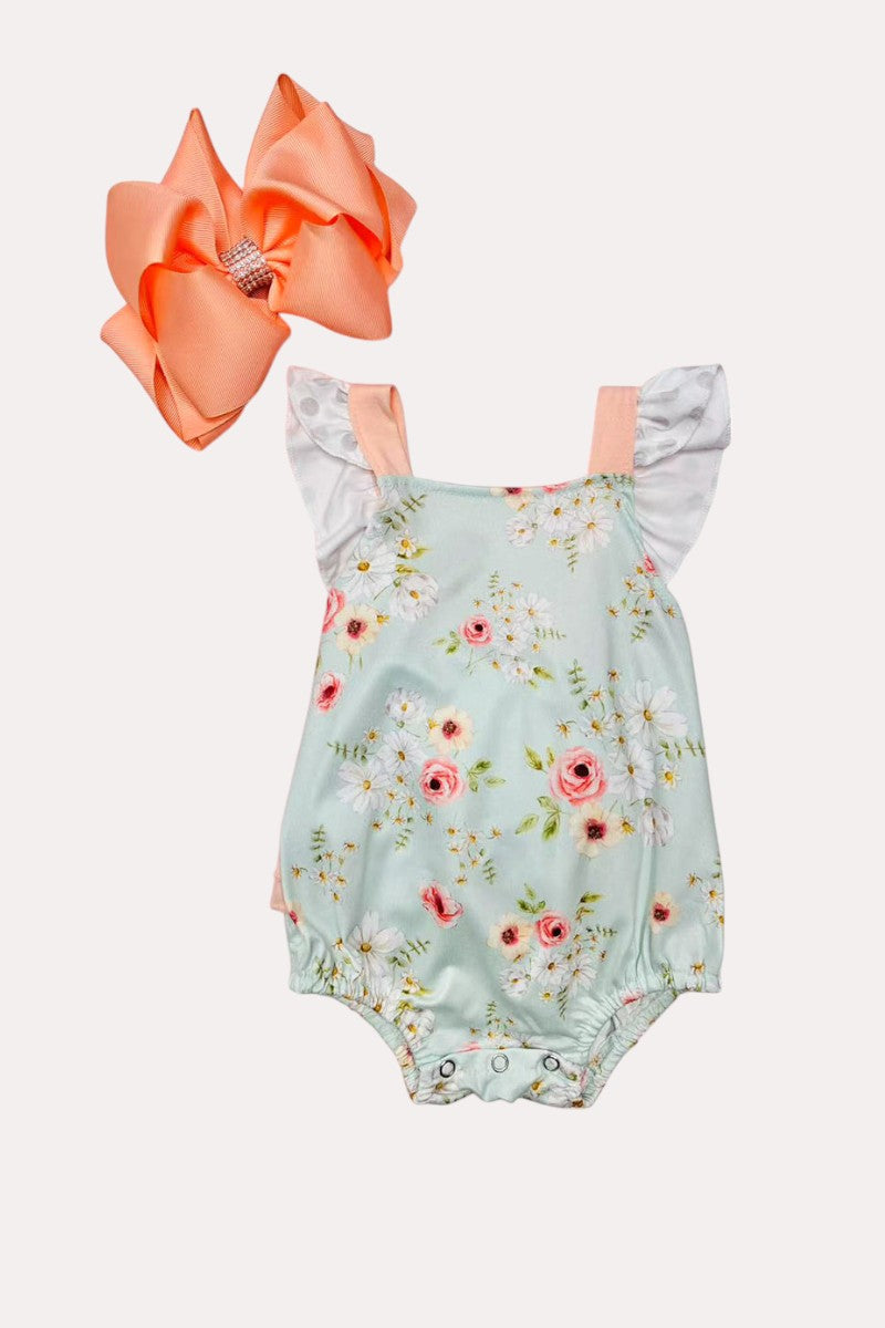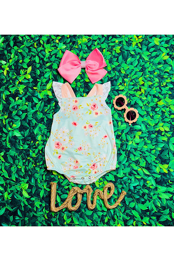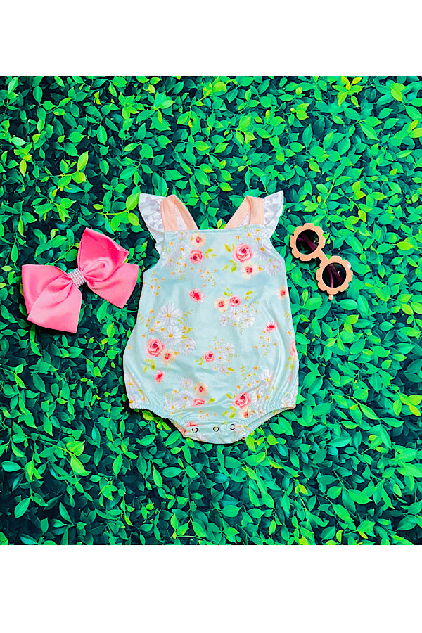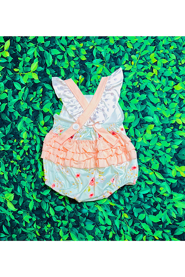 - Romper features floral print on light aqua background w/polka dot hem & peach ruffles w/crisscross straps.