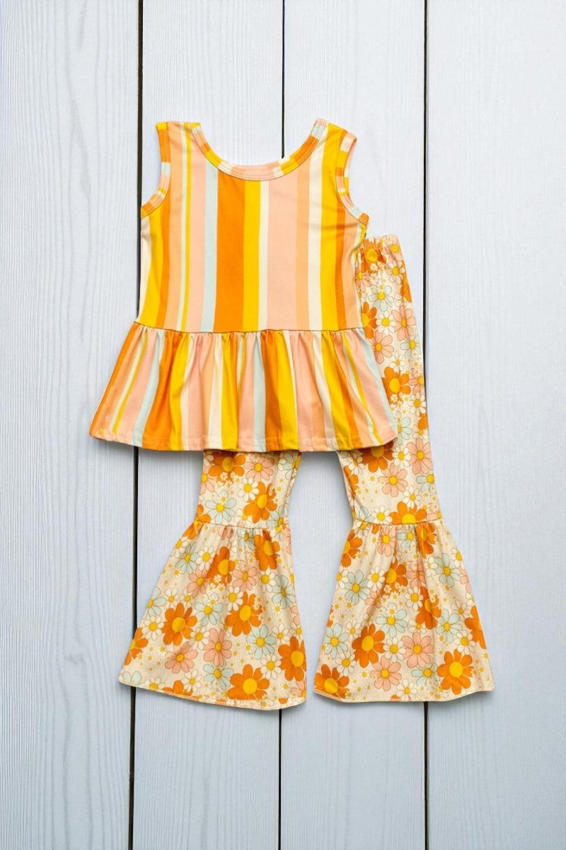 Peach tones floral & stripped sleeveless top bell bottom girls set 1135WY