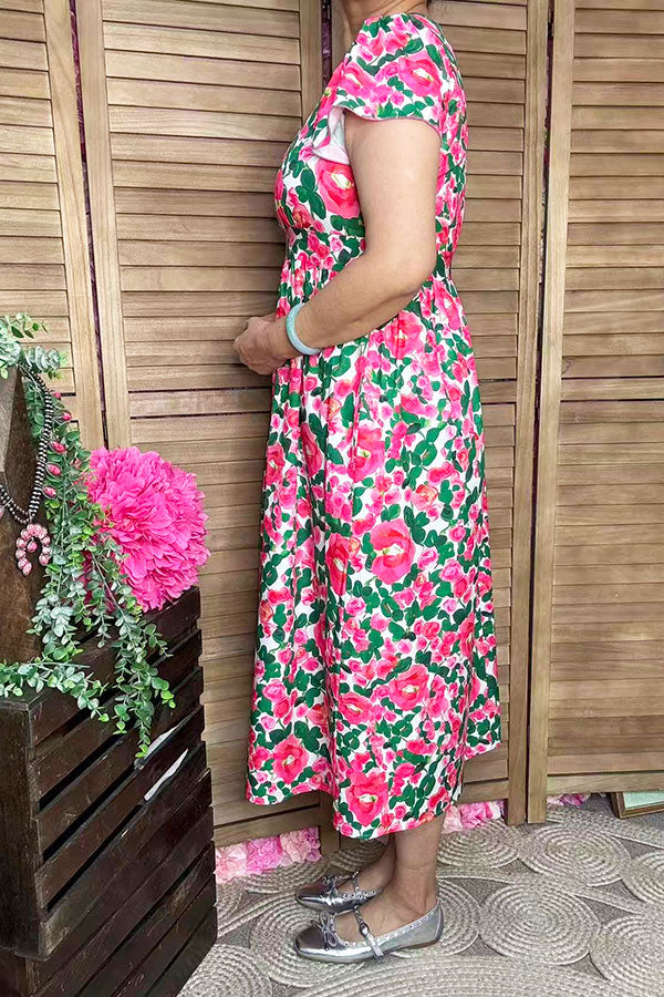 Dresses features with pink & green floral printed on white background with puff cap sleeves & side pockets.