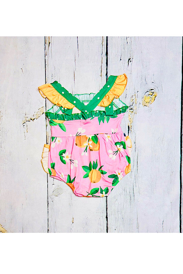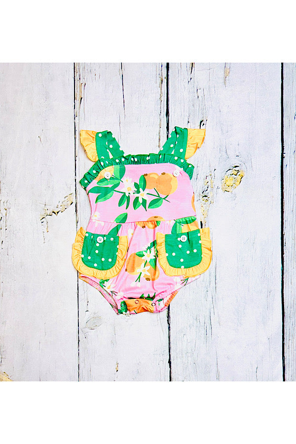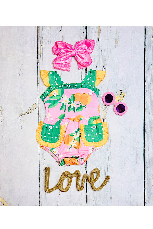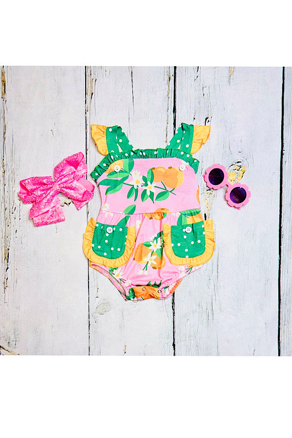 - Romper features floral & peaches print on pink background & green w/polka dots pockets on sleeveless cut.