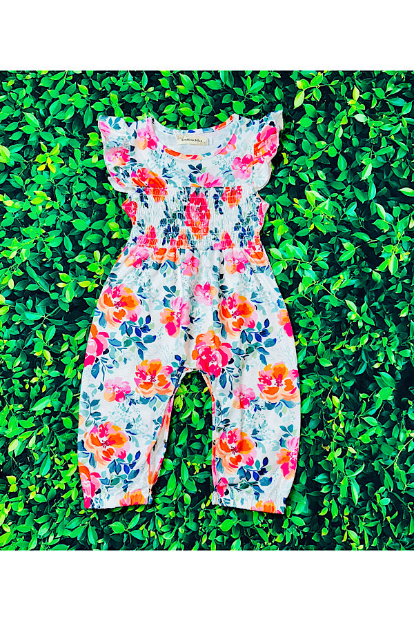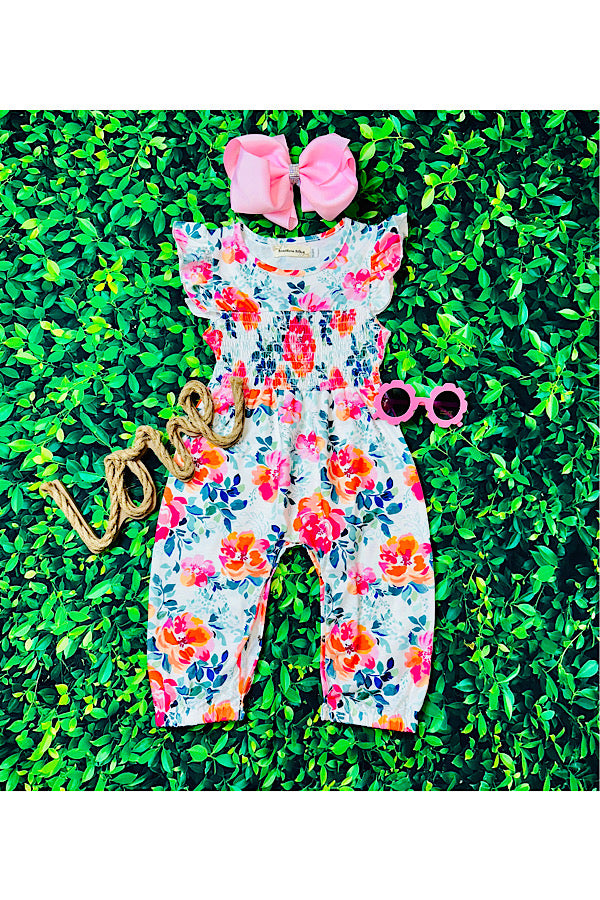 - Romper features pink & orange floral print w/smocked chest line & ruffle short sleeve.