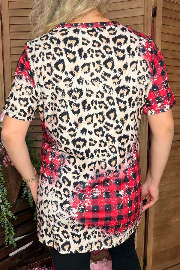 Top features with “PUCKER UP cowboy” & horse riding prints on checkered & leopard background with short sleeves.